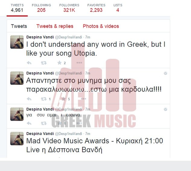Λίγο μετά τις 3.00 τα μεσάνυχτα, η Δέσποινα Βανδή φερόταν να έχει αϋπνίες, αφού για αρκετή ώρα έκανε post στο twitter της το ένα μετά το άλλο. Tweets όμως που δεν είχαν καμία συνοχή μεταξύ τους και που έκαναν και τους followers της να απορήσουν με το τι συμβαίνει στην τραγουδίστρια αφού δεν τους είχε συνηθίσει σε τέτοιου είδους διαδικτυακή συμπεριφορά.