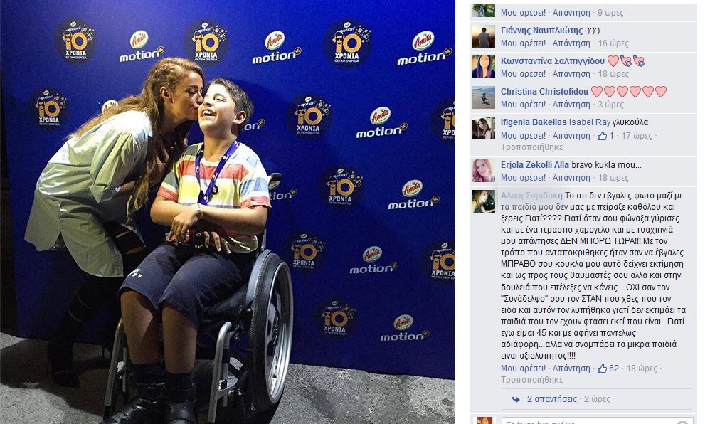 "Το ότι δεν έβγαλες φωτό μαζί με τα παιδιά μου δεν μας με πείραξε καθόλου και ξέρεις γιατί;;; Γιατί όταν σου φώναξα γύρισες και με ένα τεράστιο χαμόγελο και με τσαχπινιά μου απάντησες ΔΕΝ ΜΠΟΡΩ ΤΩΡΑ!!! με τον τρόπο που ανταποκρίθηκες ήταν σαν να έβγαλες. ΜΠΡΑΒΟ σου κούκλα μου αυτό δείχνει εκτίμηση και ως προς τους θαυμαστές σου αλλα και στην δουλειά που επέλεξες να κάνεις... ΟΧΙ σαν τον "Συνάδελφο" σου τον ΣΤΑΝ που χθες που τον είδα και αυτόν τον λυπήθηκα γιατί δεν εκτιμάει τα παιδιά που τον έχουν φτάσει εκεί που είναι.. Γιατί εγώ είμαι 45 και με αφήνει παντελώς αδιάφορη...αλλά να σνομπάρει τα μικρά παιδιά είναι αξιολύπητος!!!!".