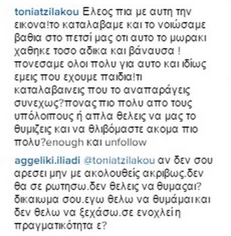 Μία εικόνα στάθηκε αφορμή για να έρθει σε κόντρα η Αγγελική Ηλιάδη με διαδικτυακή της φίλη και να αναγκαστεί να της ζητήσει να την κάνει unfollow. Η Αγγελική Ηλιάδη το βράδυ του Σαββάτου 5 Σεπτεμβρίου, δημοσίευσε μία εικόνα του άτυχου μικρού αγοριού που έχασε τη ζωή του άδικα.Με αφορμή τη εικόνα μια διαδικτυακή της φίλη της έγραψε: "Έλεος πια με αυτή την εικόνα! το καταλάβαμε και το νοιώσαμε βαθιά στο πετσί μας ότι αυτό το μωράκι χάθηκε τόσο άδικα και βάναυσα !πονέσαμε όλοι πολύ για αυτό και ιδίως εμείς που έχουμε παιδιά! Τι καταλαβαίνεις που το αναπαράγεις συνεχώς? Πονάς πιο πολύ από τους υπόλοιπους ή απλά θέλεις να μας το θυμίζεις και να θλιβόμαστε ακόμα πιο πολύ? Εnough και unfollow".Η απάντηση της Αγγελική Ηλιάδη στο συγκεκριμένο σχόλιο ήταν η εξής: "Αν δεν σου αρέσει μην με ακολουθείς ακριβώς. Δεν θα σε ρωτήσω. δεν θέλεις να θυμάσαι? Δικαίωμά σου. Εγώ θέλω να θυμάμαι και δεν θέλω να ξεχάσω. Σε ενοχλεί η πραγματικότητα ε?"