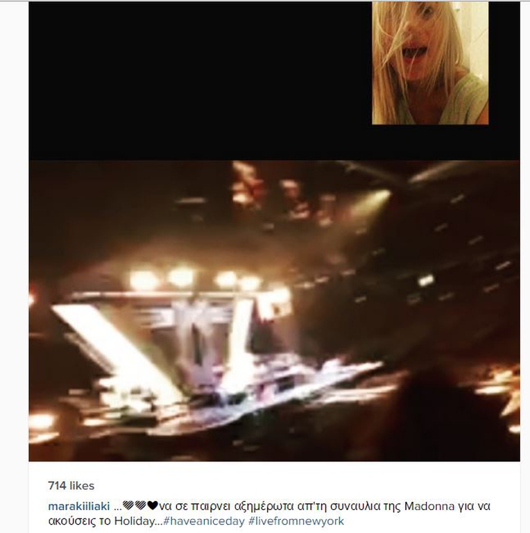 Ένας φίλος της παρουσιάστριας βρέθηκε σε συναυλία της βασίλισσας της pop και την πήρε βίντεο κλήση προκειμένου να πάρει μία γεύση από το υπερθέαμα. Μάλιστα η Μαρία Ηλιάκη δημοσίευσε μία φωτογραφία στον προσωπικό της λογαριασμό στο Instagram, γράφοντας: “Να σε παίρνει αξημέρωτα απ' τη συναυλία της Madonna για να ακούσεις το Holiday”.