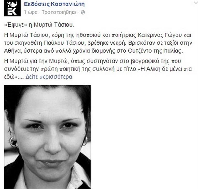 Η είδηση συγκλονίζει το πανελλήνιο. Η κόρη της Κατερίνας Γώγου, Μυρτώ Τάσιου βρέθηκε νεκρή. Τα τελευταία χρόνια η Μυρτώ Τάσιου βρισκόταν στην Ιταλία, όμως σύμφωνα με την δημοσίευση των εκδόσεων Καστανιώτη, η ποιήτρια βρισκόταν στην Αθήνα. Η δημοσίευση του εκδοτικού οίκου αναφέρει τα εξής: "Η Μυρτώ Τάσιου, κόρη της ηθοποιού και ποιήτριας Κατερίνας Γώγου και του σκηνοθέτη Παύλου Τάσιου, βρέθηκε νεκρή. Βρισκόταν σε ταξίδι στην Αθήνα, ύστερα από πολλά χρόνια διαμονής στο Ουτζέντο της Ιταλίας.