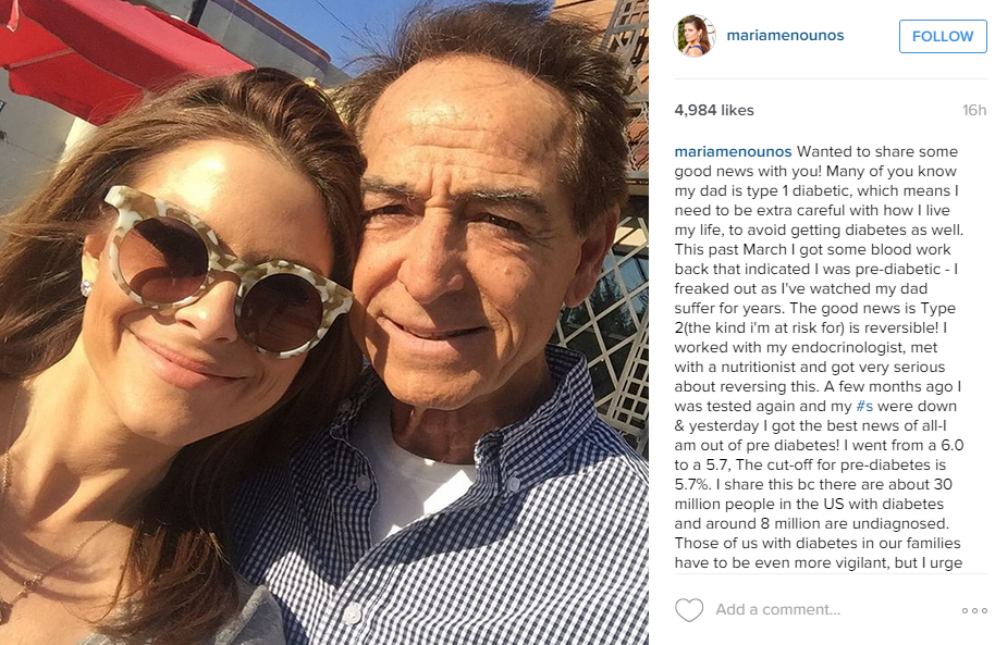 "Πολλοί από εσάς, γνωρίζετε ότι ο μπαμπάς μου έχει διαβήτη τύπου 1. Αυτό σημαίνει ότι κι εγώ θα πρέπει να προσέχω πολύ τον τρόπο ζωής μου, ώστε να αποκλείσω την πιθανότητα να νοσήσω κι εγώ. Τον περασμένο Μάρτιο, έκανα εξετάσεις αίματος που έδειξαν πως βρίσκομαι σε προ διαβητικό στάδιο. Φρίκαρα καθώς όλα αυτά τα χρόνια είχα δει πώς υπέφερε ο μπαμπάς μου. Τα καλά νέα είναι, ότι ο διαβήτης Τύπου 2 (τον οποίο έχω πιθανότητες να πάθω) είναι αναστρέψιμος!