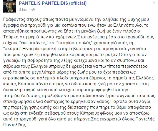Με νέα του ανάρτηση στο facebook ο Παντελής Παντελίδης ανάφερε την πηγή έμπνευσής του για το τραγούδι που προκάλεσε σάλο στους Κυπρίους για τα κατεχόμενα. Ο ίδιος όπως έγραψε έζησε "το μεγαλύτερο μέρος της ζωής μου το έχω περάσει ως στρατιωτικός σε πολεμικά πλοία υπερασπιζόμενος τη σημαία της Ελλάδας και της Κύπρου" προσθέτοντας ότι όλο αυτό που έγινε τον πίκρανε πολύ. Ο τραγουδιστής επισήμανε ακόμη ότι θα αποσύρει το τραγούδι σε ένδειξη σεβασμού προς όλους τους Κυπρίους.