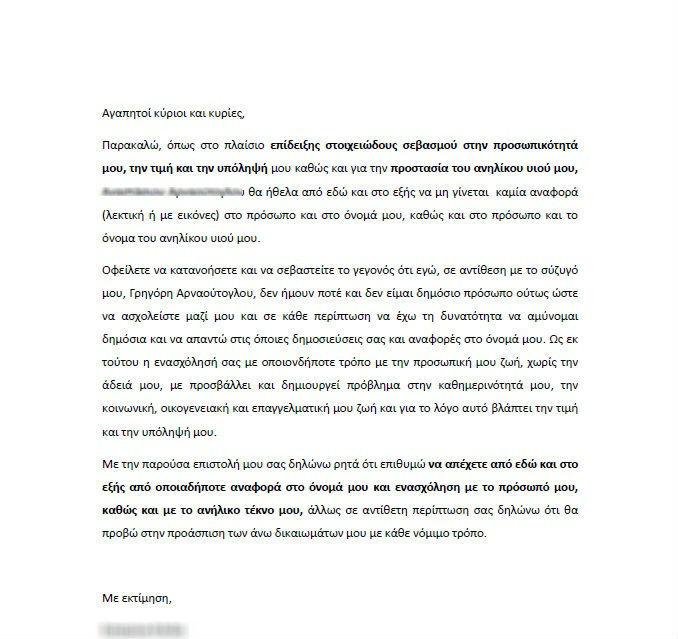 Η σύζυγος του Γρηγόρη Αρναούτογλου απέστειλε προς όλα τα Μέσα Ενημέρωσης πριν λίγη ώρα μια επιστολή.