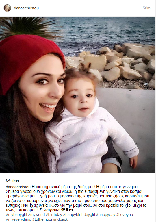 Στη λεζάντα που συνόδευσε την εικόνα, έγραψε: “Η πιο σημαντική μέρα της ζωής μου! Η μέρα που σε γέννησα! Σήμερα γίνεσαι δύο χρόνων και νιώθω η πιο ευτυχισμένη γυναίκα στον κόσμο! Σμαράγδενια μου....ζωή μου ! Σμαράγδα της καρδιάς μου !Να ζήσεις κοριτσάκι μου να ζω να σε καμαρώνω ,να έχεις πάντα στο πρόσωπο σου χαμόγελα χαράς και ευτυχίας ! Να έχεις υγεία !! Όσο για την μαμά σου...θα σου κρατάει το χέρι μέχρι το τέλος του κόσμου ! Σε λατρεύω!”. Αρκετοί ήταν οι διαδικτυακοί της φίλοι που έσπευσαν να αφήσουν όμορφες ευχές κάτω από την ανάρτηση της ηθοποιού.