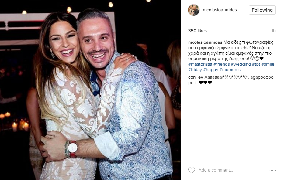 Ο Νικόλας πόσταρε μία φωτογραφία, όπου απεικονίζεται ο ίδιος αγκαλιά με την παρουσιάστρια, με την οποία συνεργάζονται την τρέχουσα τηλεοπτική σεζόν, από το γαμήλιο πάρτι της στην Κύπρο και την ανέσυρε από το facebook.