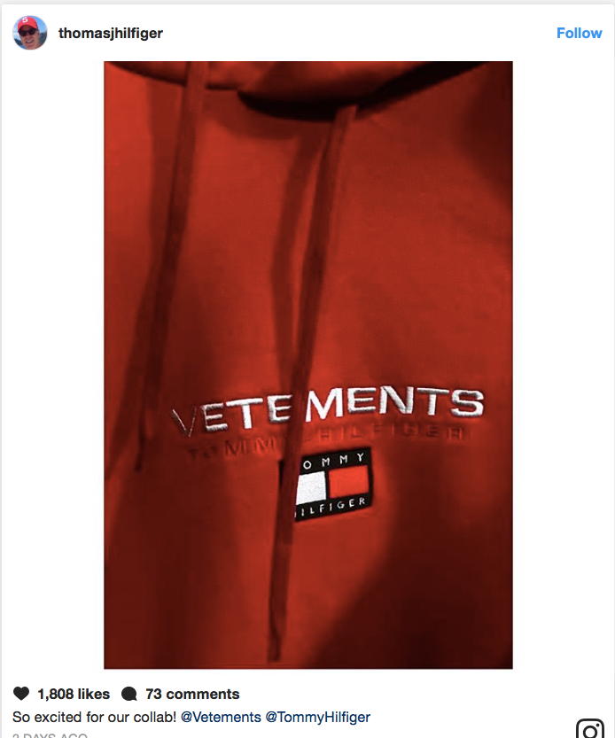 Ανεβάζοντας ένα κατακόκκινο hoodie στο λογαριασμό του στο instagram, ο Hilfiger ανακοίνωσε τη συνεργασία του αμερικανικού brand Tommy Hilfiger με το cool brand Vetements.
