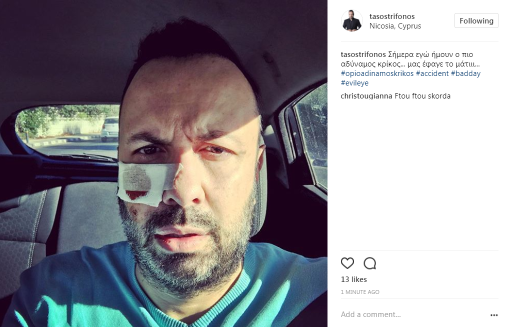 Ο παρουσιαστής και ραδιοφωνικός παραγωγός, ανήρτησε μία φωτογραφία στον προσωπικό του λογαριασμό στο instagram, όπου απεικονίζεται με τραύμα λίγο πιο κάτω από το μάτι, γράφοντας στη λεζάντα που συνόδευσε την εικόνα: “Σήμερα εγώ ήμουν ο πιο αδύναμος κρίκος... μας έφαγε το μάτι”, χωρίς να διευκρινίζει τι του έχει συμβεί.