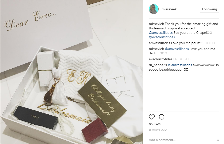 Στο πλευρό της στην εκκλησία, θα βρίσκεται η πολύ καλή της φίλη, Ήβη Κυπριανού και μάλιστα, της απέστειλε ένα πακέτο, με όμορφα δωράκια, ζητώντας της να γίνει η κουμπάρα της, κάτι που βεβαίως αποδέχθηκε.