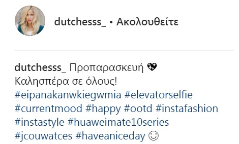 Η Δούκισσα Νομικού μπορεί να παραδέχθηκε την εγκυμοσύνη της, αλλά όλο αυτό το διάστημα απέφευγε να κάνει αναρτήσεις που να φαίνεται οι φουσκωμένη της κοιλίτσα…Αφού πλέον έχει κλείσει τον πέμπτο μήνα η ίδια ένιωσε πιο άνετα και ανέβασε στον προσωπικό της λογαριασμό μία φωτογραφία που ποζάρει στο ασανσέρ και δείχνει την φουσκωμένη της κοιλίτσα. Μάλιστα όπως έγραψε και στη λεζάντα αυτή είναι η πρώτη selfie που βγάζει στο ασανσέρ και μοιράζεται με τους διαδικτυακούς της φίλους. Η Δούκισσα Νομικού προσέχει πάρα πολύ την διατροφή της και δεν αφήνει τον εαυτό της με αποτέλεσμα να έχει πάρει πάρα πολύ λίγα κιλά. Δείτε την: