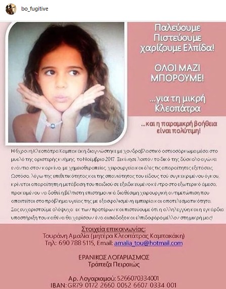Μπορείτε κι εσείς να βοηθήσετε!!!! Λογαριασμό Τράπεζας Πειραιώς με αριθμό 5266070334001, IBAN: GR79 0172 2660 0052 6607 0334 001. SWIFT-BIC: PIRBGRAA. Δικαιούχοι: Τουράνη Αμαλία, Καμπακάκη Κλεοπάτρα. Επιπλέον μπορείτε να επικοινωνήσετε με την μητέρα της, Τουράνη Αμαλία, στο τηλέφωνο 690 788 5115 και στο e-mail amalia_tou@hotmail.com