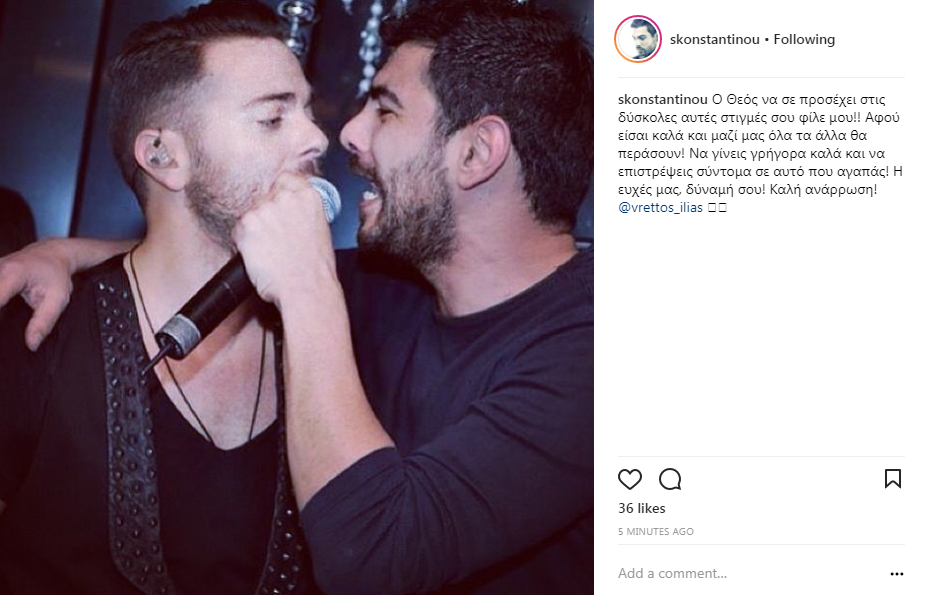 Ο Κύπριος τραγουδιστής, Σταύρος Κωνσταντίνου, ανήρτησε μία εικόνα στον προσωπικό του λογαριασμό στο instagram, όπου απεικονίζεται μαζί με τον Ηλία Βρεττό, γράφοντας στη λεζάντα που τη συνόδευσε: “Ο Θεός να σε προσέχει στις δύσκολες αυτές στιγμές σου φίλε μου!! Αφού είσαι καλά και μαζί μας όλα τα άλλα θα περάσουν! Να γίνεις γρήγορα καλά και να επιστρέψεις σύντομα σε αυτό που αγαπάς! Η ευχές μας, δύναμή σου! Καλή ανάρρωση!”