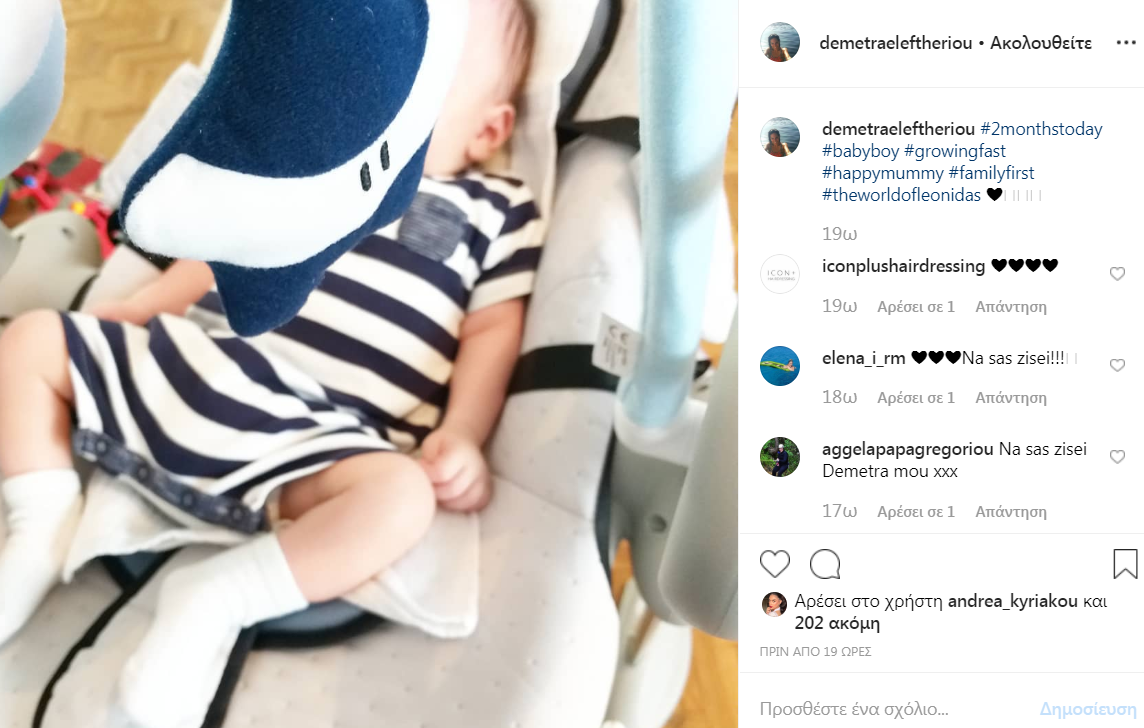 Ο λόγος για τη Δήμητρα Ελευθερίου η οποία μέσα από μία ανάρτησή της στον προσωπικό της λογαριασμό στο instagram μας ενημέρωσε για τον ερχομό του δεύτερου γιου της. Μάλιστα ο μικρούλης, που θα πάρει το όνομα Λεωνίδας, ήρθε στον κόσμο τον περασμένο Μάιο.