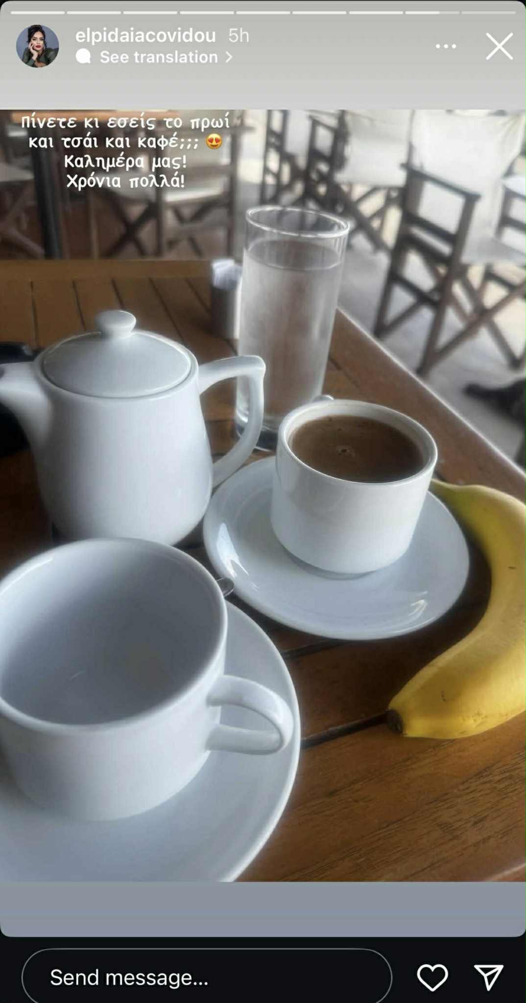 Συγκεκριμένα, στο πάνω μέρος του story η Ιακωβίδου έγραψε: «Πίνετε κι εσείς το πρωί και τσάι και καφέ; Καλημέρα μας!». Δείτε το σχετικό στιγμιότυπο: