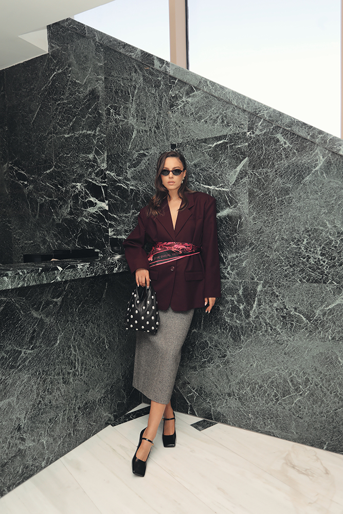 Σακάκι Gestuz / Φούστα ISABELLE BLANCHE / Μεταξωτό φουλάρι Versace Jeans Couture / Τσάντα A.L.C / Γόβες Vanda Novak Peggy / Γυαλιά ηλίου Saint Laurent