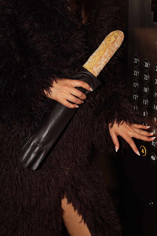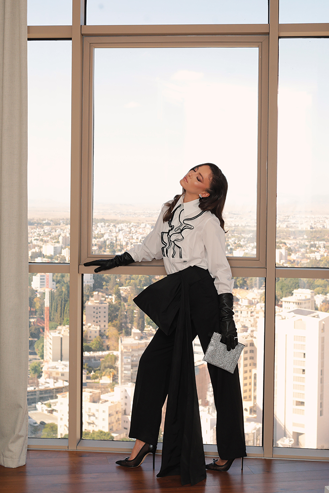 Βαμβακερό πουκάμισο Karl Lagerfeld / Παντελόνι Karl Lagerfeld Studio / Δερμάτινα γάντια Answear.LAB / Σκουλαρίκια Swarovski MATRIX / Γόβες Elisabetta Franchi / Τσάντα Answear.LAB