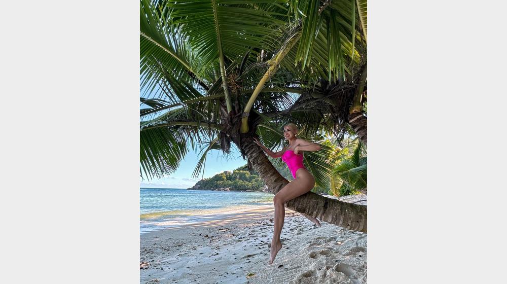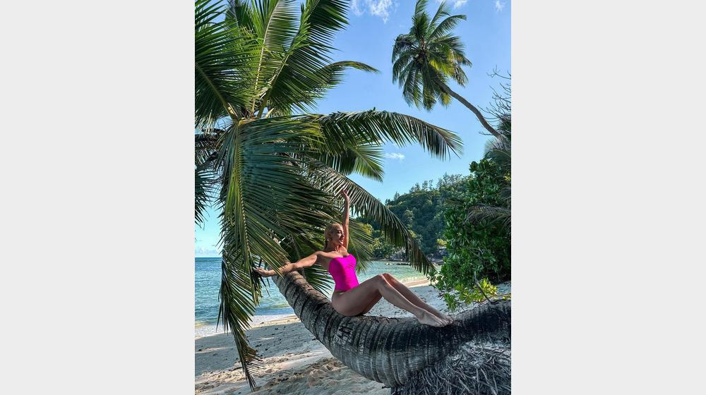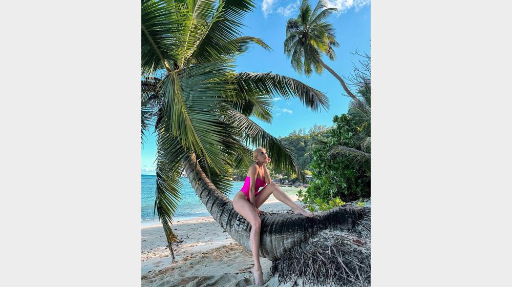 Ο ενθουσιασμός και η χαρά της δεν κρύβεται, ποζάροντας μέσα στο ιδιαίτερα θηλυκό φούξια μαγιό της με φόντο το ειδυλλιακό σκηνικό με φοίνικες και ένα τοπίο όπου το πράσινο σμίγει με τα καταγάλανα νερά του Ινδικού ωκεανού. Δείτε στην πιο κάτω gallery τις σχετικές εικόνες που εντοπίσαμε στα social media: