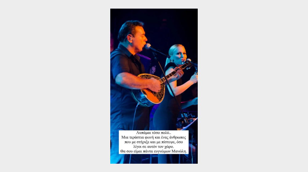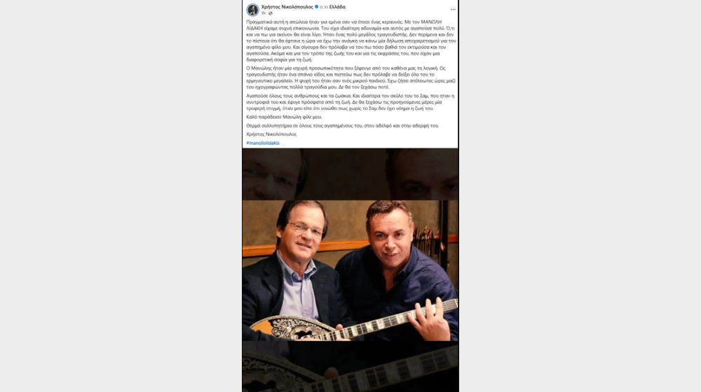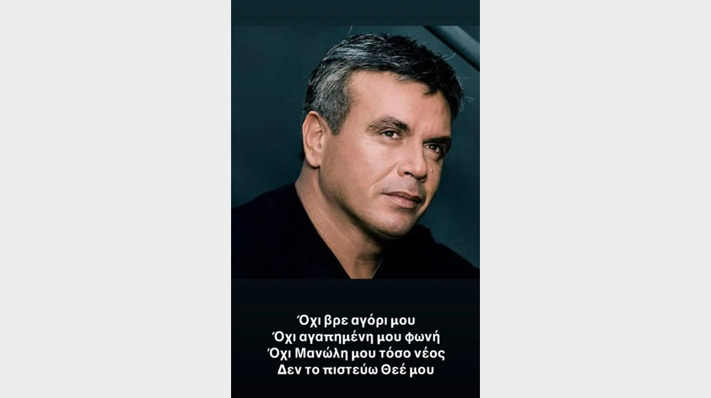 Συντετριμμένοι είναι οι εκπρόσωποι του καλλιτεχνικού κόσμου για τον χαμό του σπουδαίου καλλιτέχνη και κάποια από τα σπουδαιότερα ονόματα της ελληνικής μουσικής βιομηχανίας θέλησαν να τον αποχαιρετήσουν και διαδικτυακά με αναρτήσεις στους προσωπικούς τους λογαριασμούς στα social media. Δείτε πιο κάτω κάποιες από τις αναρτήσεις που εντοπίσαμε: