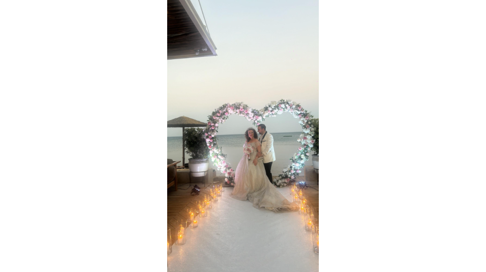Το ζευγάρι, αρχικά, προχωρώντας μπροστά στη λουλουδένια αψίδα σε σχήμα καρδιάς, δέχθηκε τα ροδοπέταλα των καλεσμένων τους, όσο στο background, υπήρχαν βαγγελικά — πυροτεχνήματα.