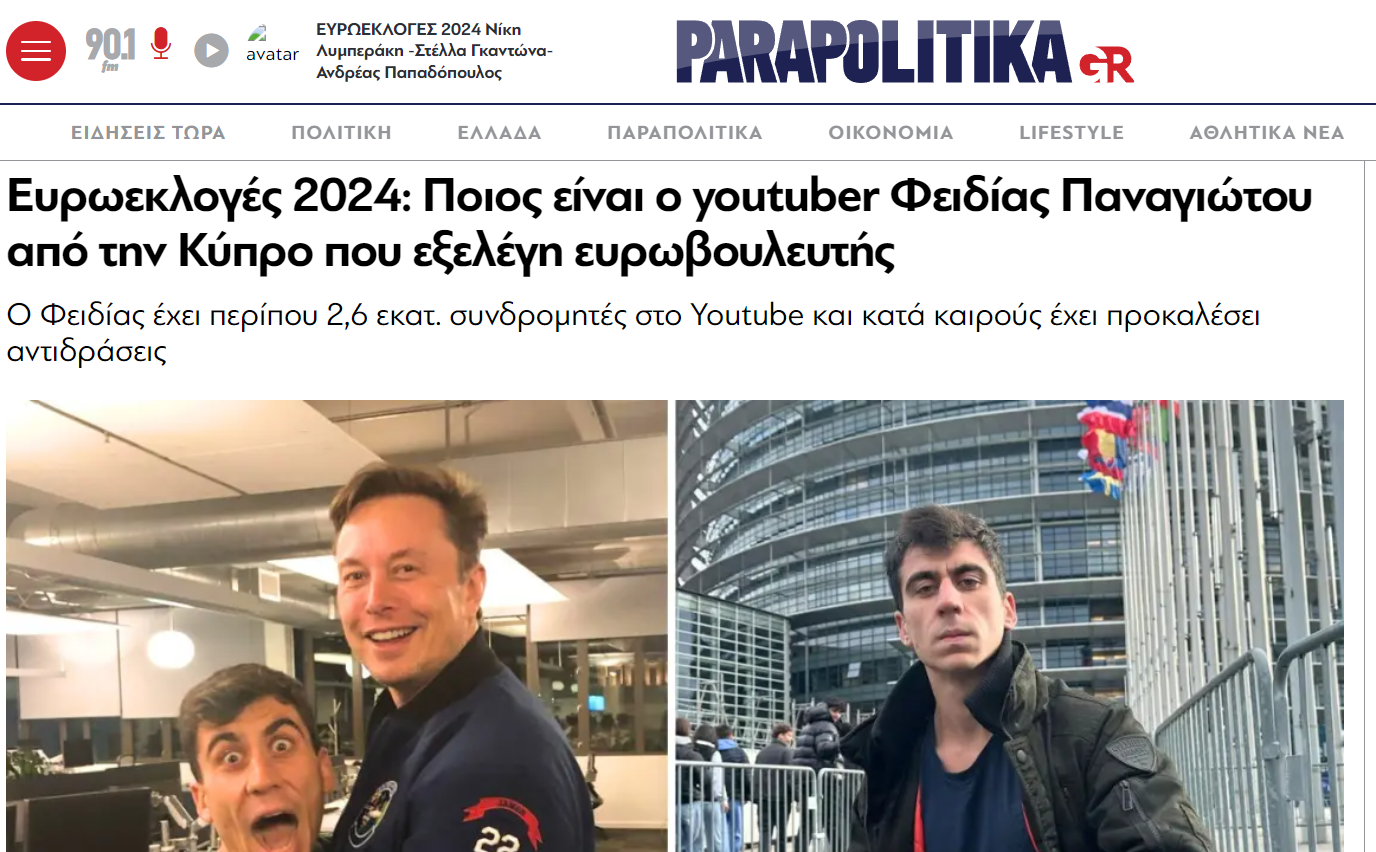 «Στην Κύπρο καταγράφεται η μεγάλη έκπληξη των ευρωεκλογών, καθώς μετά την παρουσίαση του exit poll για τις εκλογές της Τοπικής Αυτοδιοίκησης και για τις ευρωεκλογές 2024 αναδείχθηκε ένας υποψήφιος εκτός της πολιτικής σκηνής. Πρόκειται για τον γνωστό tiktoker με το όνομα «Fidias» ο οποίος κατεβαίνει στις ευρωεκλογές ως ανεξάρτητος», αναφέρει το Έθνος.