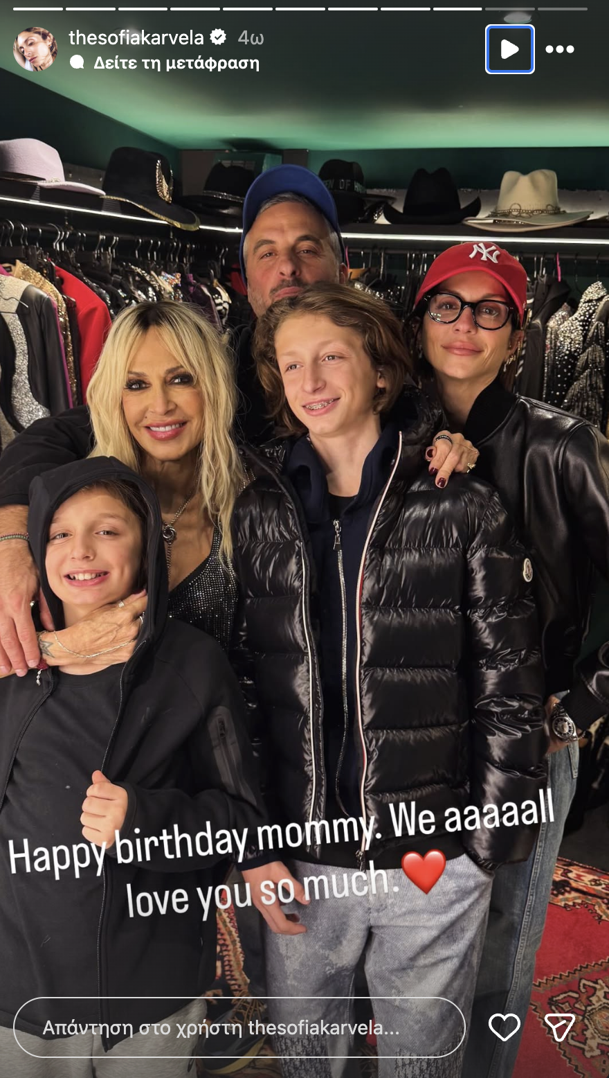 Χαρακτηριστικά, η εορτάζουσα είχε στο πλευρό της, την κόρη της, Σοφία Καρβέλα, καθώς και τους δυο της εγγονούς, Νίκο και Νέστορα, τη στιγμή που έσβησε μια τεράστια τούρτα- υπέρπαραγωγή.