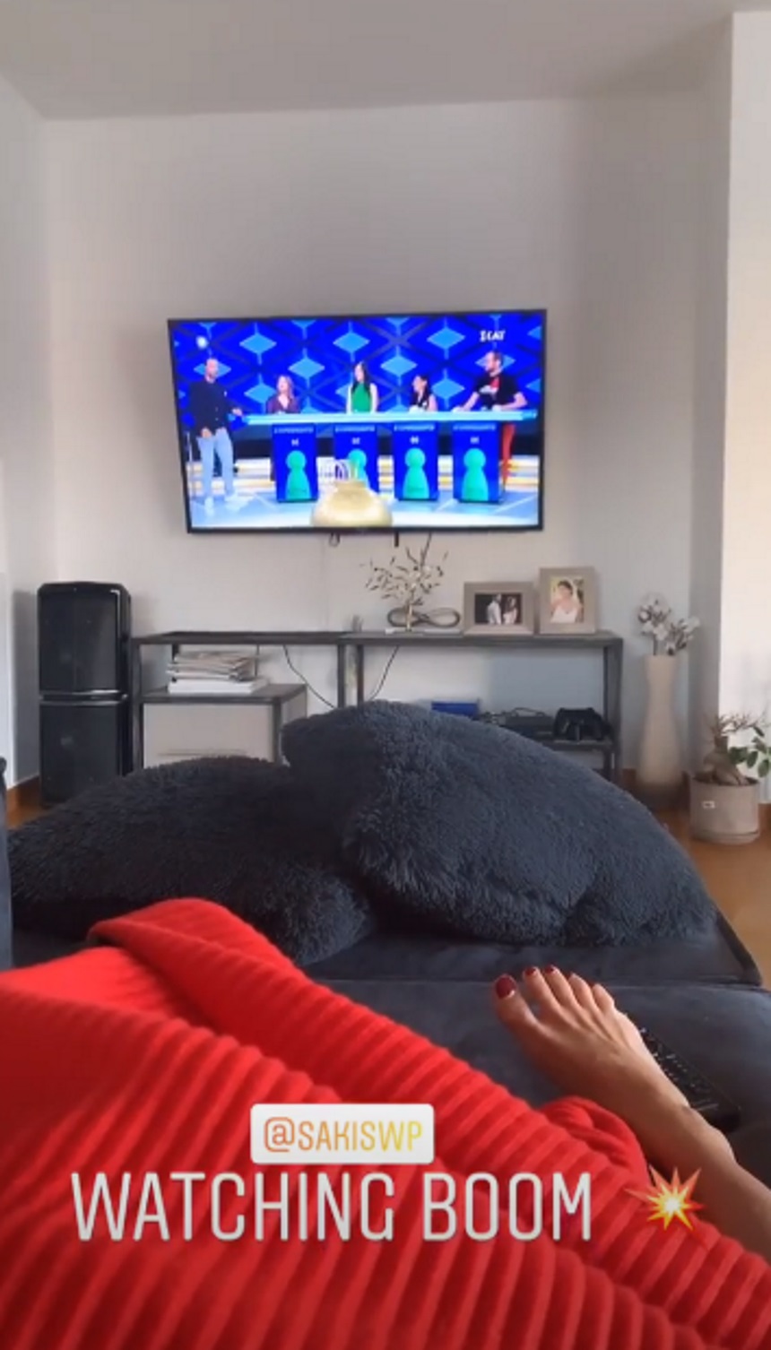 Συγκεκριμένα το μοντέλο ανήρτησε ένα story στον προσωπικό του λογαριασμό στο instagram, με την ίδια να ξαπλώνει στον καναπέ του σαλονιού τους και να παρακολουθεί από την τηλεόραση τον σύζυγο της, στο τηλεπαιχνίδι "Boom", που προβάλλει η τηλεόραση ΣΙΓΜΑ.