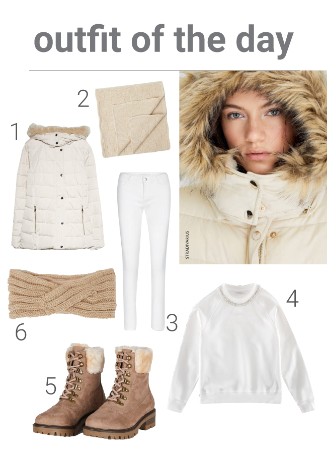 Οι χειμερινές μας εξορμήσεις στη φύση μπορούν να είναι στιλάτες και παράλληλα πρακτικές και άνετες. Το λευκό μπουφάν συνδυάζεται με skinny jeans στο ίδιο χρώμα και μπεζ ορειβατικά μποτάκια. Ένα πλεκτό head piece και ένα μάλλινο φουλάρι στις ίδιες αποχρώσεις μας ζεσταίνουν με τον καλύτερο τρόπο.