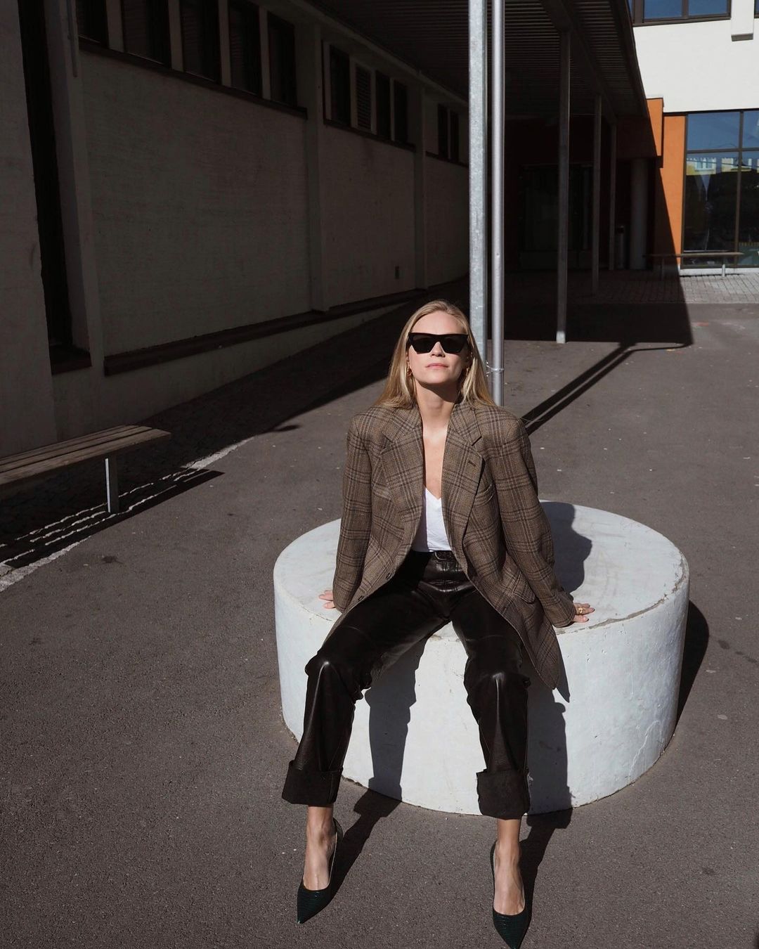 Μπορείς, λοιπόν, να επιλέξεις ένα δερμάτινο παντελόνι σε σκούρα καφέ απόχρωση και συνδύασε το με ένα λευκό μπλουζάκι, ένα checked κομψό blazer από πάνω και τις γόβες σου.