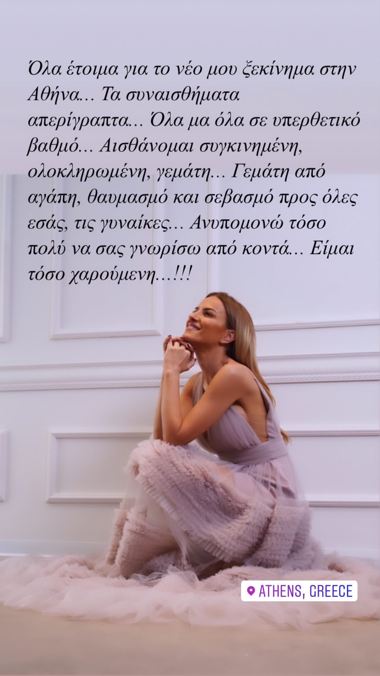 “Όλα έτοιμα για το νέο μου ξεκίνημα στην Αθήνα… Τα συναισθήματα απερίγραπτα. Όλα μα όλα σε υπερθετικό βαθμό. Αισθάνομαι συγκινημένη, ολοκληρωμένη, γεμάτη. Γεμάτη από αγάπη, θαυμασμό και σεβασμό προς όλες εσάς, τις γυναίκες. Ανυπομονώ τόσο πολύ να σας γνωρίσω από κοντά. Είμαι τόσο χαρούμενη”, εξομολογήθηκε η σχεδιάστρια. Δείτε πιο κάτω τη σχετική εικόνα: