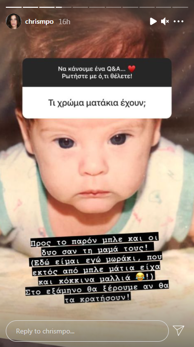 Συγκεκριμένα, ρωτήθηκε το χρώμα ματιών των κοριτσιών της, με την ίδια να βρίσκει ευκαιρία και να μοιράζεται μαζί μας δική της εικόνα από όταν ήταν παιδί, σχολιάζοντας τα εξής: "Προς το παρόν μπλε και οι δυο σαν τη μαμά τους. Εδώ εγώ είμαι μωράκι, που εκτός από μπλε μάτια είχα και κόκκινα μαλλιά". Δείτε πιο κάτω τη σχετική εικόνα: