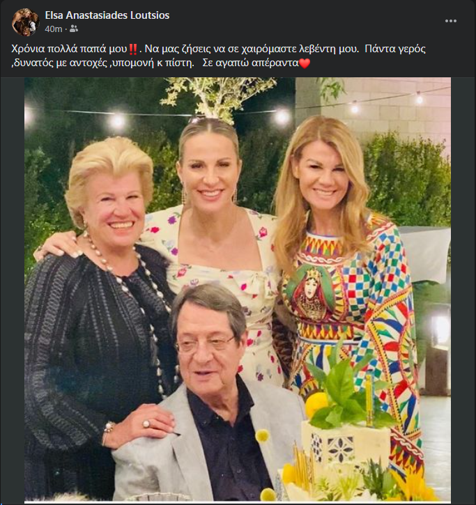Τα 75α γενέθλιά του γιορτάζει σήμερα ο Νίκος Αναστασιάδη, Πρόεδρος της Κυπριακής Δημοκρατίας και η κόρη του Έλσα θέλησε να του ευχηθεί και διαδικτυακά, αναρτώντας ένα οικογενειακό τους στιγμιότυπο στο facebook.
