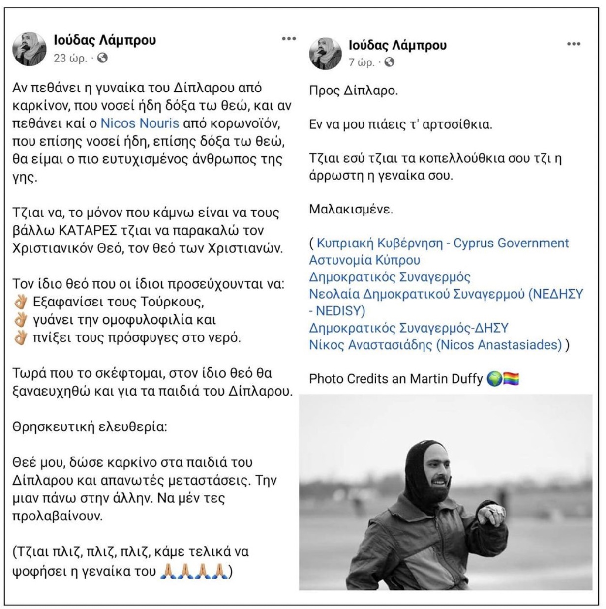 Σοκαρισμένοι οι διαδικτυακοί φίλοι του Ευθύμιου Δίπλαρου δεν μπορούσαν να πιστέψουν τα λόγια που δημοσίευσε ο αντιπρόεδρος του ΔΗΣΥ με τις κατάρες που δέχθηκε από συμπολίτη μας τόσο για εκείνον όσο και για τη γυναίκα του που παλεύει στη Γερμανία με τον καρκίνο. Το χειρότερο είναι πως δεν πρόκειται για έναν άνθρωπο ποιυ κρύβεται πίσω από το πληκτρολόγιο του καθώς μια απλή επίσκεψη στο προφιλ του συγκεκριμένου που θέλει να ανήκει στην κατηγορία των ανθρώπων θα δει πως πρόκειται για υπαρκτό πρόσωπο.