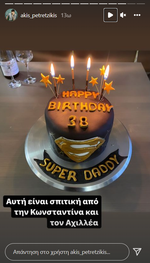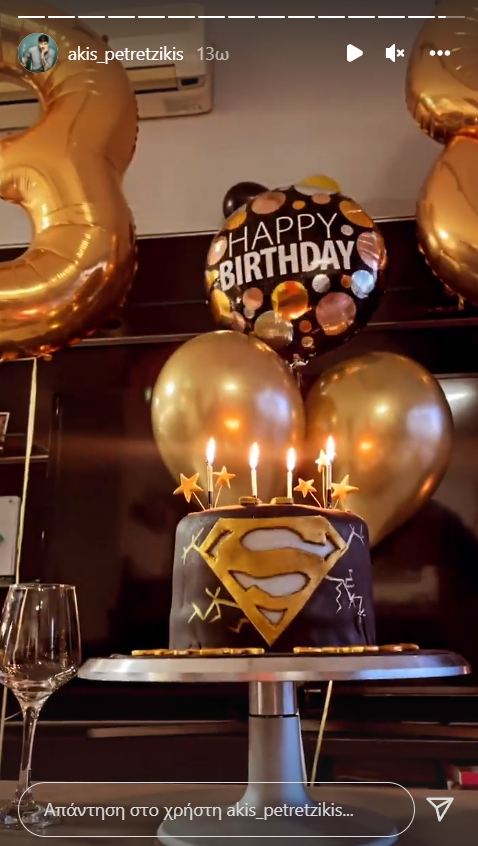 Συγκεκριμένα όπως είδαμε σε instastory που έκανε στον προσωπικό του λογαριασμό, με την άφιξη του στο σπίτι τον περίμενε μια εντυπωσιακή τούρτα την οποία ετοίμασε η σύζυγος του με τη βοήθεια του μικρού Πετρετζίκη, αλλά και μια σύνθεση με μπαλόνια, τα οποία "πρόδιδαν" την ηλικία του. Δείτε πιο κάτω τις σχετικές εικόνες: