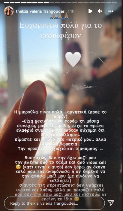 Στο instastory η Κύπρια επώνυμη αποκάλυψε πως η μικρή είναι αρνητική μέχρι στιγμής, ενώ μητέρα και κόρη μένουν στο πατρικό τους σπίτι σε χωριστά δωμάτια, με την Ζακελίνα να την προσέχουν η γιαγιά και ο παππούς. Δείτε όλα όσα είπε η Θέλξια Βαλέρια στην εικόνα πιο κάτω: