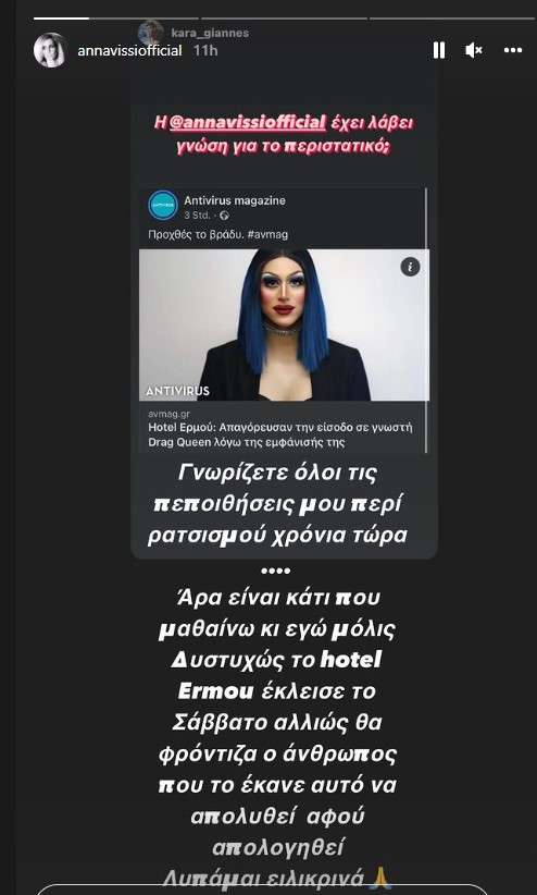Μαθαίνοντας κάτι τέτοιο η Κύπρια τραγουδίστρια φρόντισε να πάρει δημόσια θέση, και να σχολιάσει τα ακόλουθα: "Γνωρίζετε όλοι τις πεποιηθήσεις μου περί ρατσισμού χρόνια τώρα. Άρα είναι κάτι που μαθαίνω κι εγώ μόλις. Δυστυχώς το hotel Ermou έκλεισε το Σάββατο αλλιώς θα φρόντιζα ο άνθρωπος που το έκανε αυτό να απολυθεί αφού απολογηθεί. Λυπάμαι ειλικρινά". Δείτε την εικόνα πιο κάτω: