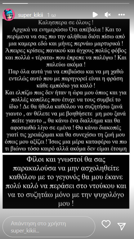 Mε ένα δημόσιο μήνυμα στον λογαριασμό της στο instagram η Super Κική αποκάλυψε ότι η εγκυμοσύνη της δεν είχε ευτυχή κατάληξη αφού τελικά απέβαλε.