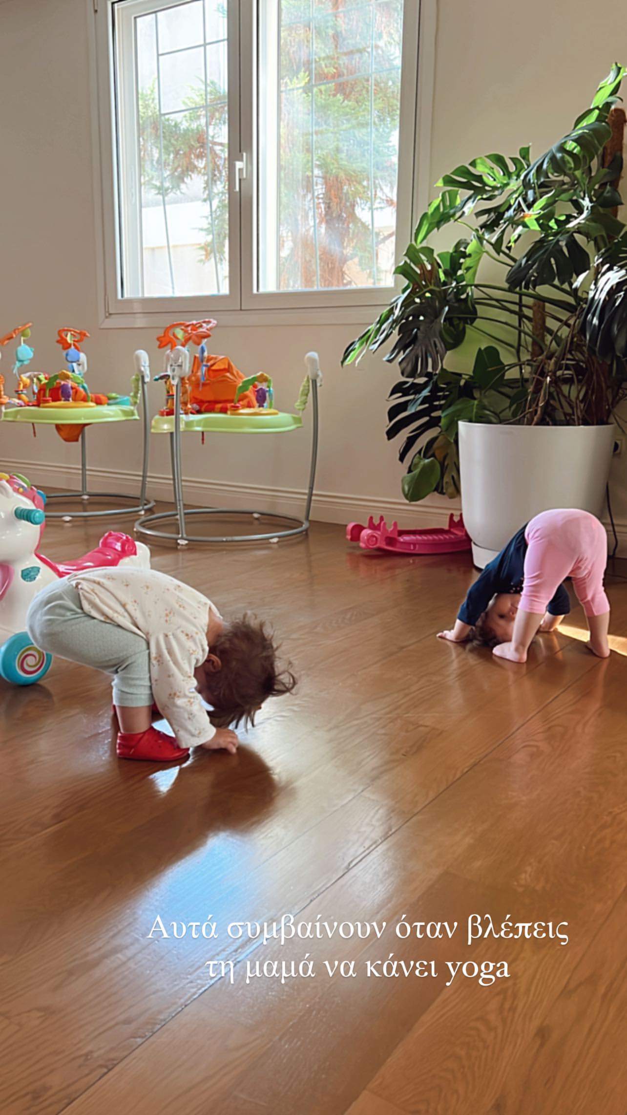 Νωρίτερα το πρωί της Πέμπτης, 20 Οκτωβρίου μοιράστηκε ένα υπέροχο βίντεο με τις Αριάνα και Φιλίππα να παίζουν στο σαλόνι του σπιτιού τους, σπρώχνοντας η μία την άλλη στο παιδικό τους όχημα ενώ κατόπιν πόσταρε μία εικόνα όπου βλέπουμε τις μικρούλες να μιμούνται τις yoga στάσεις της μαμάς τους και τις λατρέψαμε. Δείτε πιο κάτω τη σχετική εικόνα και το βίντεο που εντοπίσαμε στα social media: