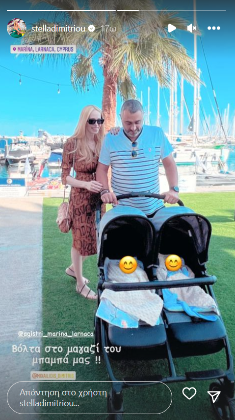 Συνοδεύομενη από τον σύζυγό της, Δημήτρη και τα δίδυμα νεογέννητα μωράκια της, η Στέλλα Δημητρίου, ανέφερε στο story, πως έφερε τα μικρά στο μαγαζί του μπαμπά τους. Δείτε την εικόνα πιο κάτω: