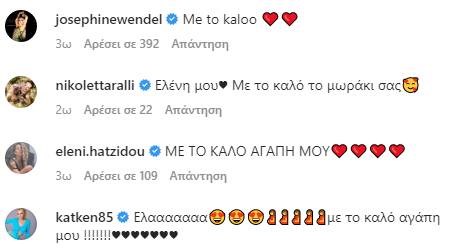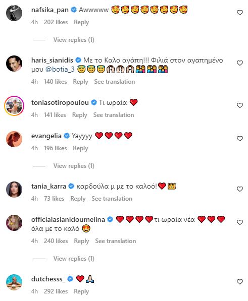 Σύσσωμη οι επώνυμοι φίλοι του ζευγαριού, έσπευσαν από τα πρώτα κιόλας λεπτά που αναρτήθηκε η δημοσίευση, να στείλουν τις ευχές τους στην Ελένη και στον Alberto, όπου ανάμεσα σε αυτούς είδαμε τους Έλενα Παπαρίζου, Κατερίνα Καινούργιου, Φαίη Σκορδά, Δούκισσα Νομικού, κ.α. Δείτε τις εικόνες πιο κάτω: