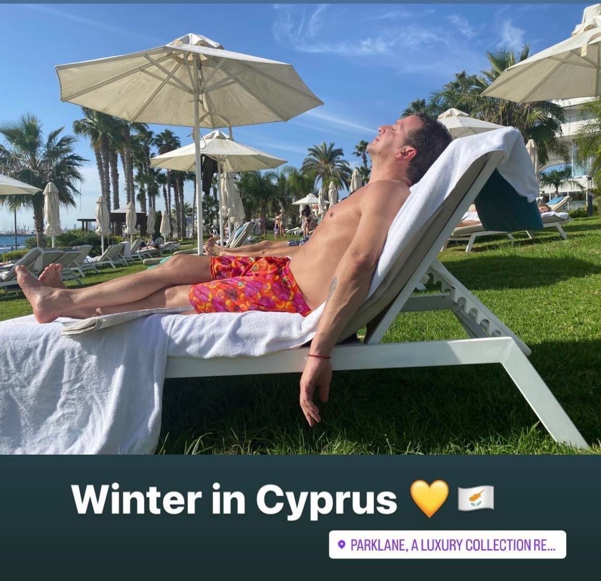 Μάλιστα ο διευθυντής της τηλεόρασης ΣΙΓΜΑ και του συγκροτήματος ΔΙΑΣ, δεν δίστασε να βάλει το μαγιό του και να απολαύσει στιγμές χαλάρωσης στη ξαπλώστρα με τη σύντροφό του να τον απαθανατίζει, γράφοντας στην εικόνα με δόση χιούμορ: "Ο χειμώνας στην Κύπρο". Δείτε πιο κάτω το σχετικό στιγμιότυπο που εντοπίσαμε στα social media: