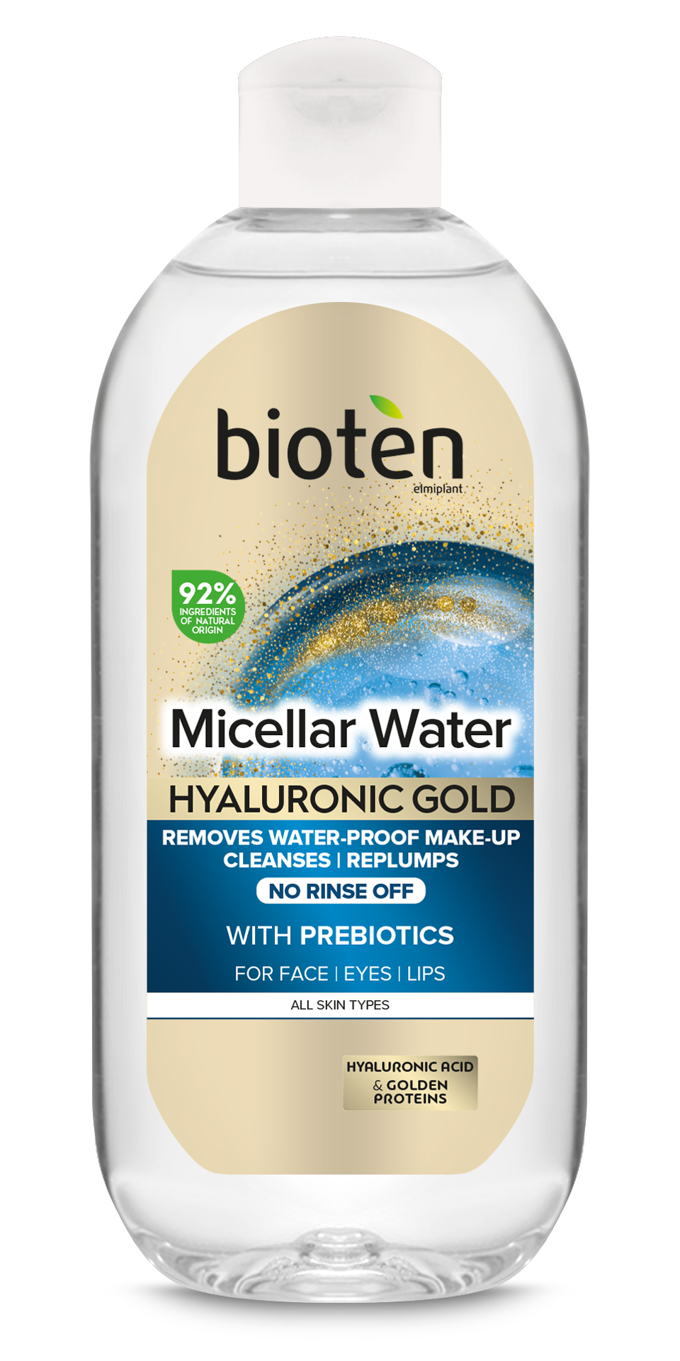 Το Hyaluronic Gold Micellar Water για όλους τους τύπους δέρματος, είναι πιο βολικός, αποτελεσματικός και ακριβής τρόπος για να αφαιρέσετε το μακιγιάζ και τους ρύπους με μία κίνηση. Η προηγμένη σύνθεσή του, που περιέχει λεπτά σωματίδια λαδιού και νερού, αιχμαλωτίζει ακόμη και το αδιάβροχο μακιγιάζ και ακαθαρσίες χωρίς να ξηραίνει το δέρμα. Είναι εμπλουτισμένο με Υαλουρονικό Οξύ και Χρυσές Πρωτεΐνες που βοηθούν στην αναδόμηση του δέρματος. Τα πρεβιοτικά που περιέχονται, βοηθούν τη χλωρίδα του δέρματος να διατηρήσει την ισορροπία, προάγοντας την υγιή εμφάνισή του.