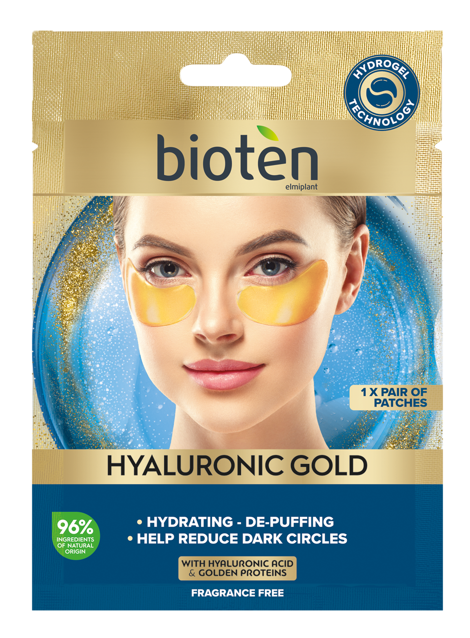 Τα επιθέματα ματιών Hyaluronic Gold είναι εμπλουτισμένα με υαλουρονικό οξύ και χρυσές πρωτεΐνες που βοηθούν την περιοχή κάτω από τα μάτια να φαίνεται πιο φωτεινή και πιο ανανεωμένη. Οι βιταμίνες και τα κεραμίδια (ceramides) που περιέχουν βοηθούν στο να διατηρείται το δέρμα σας υγιές και νεανικό.