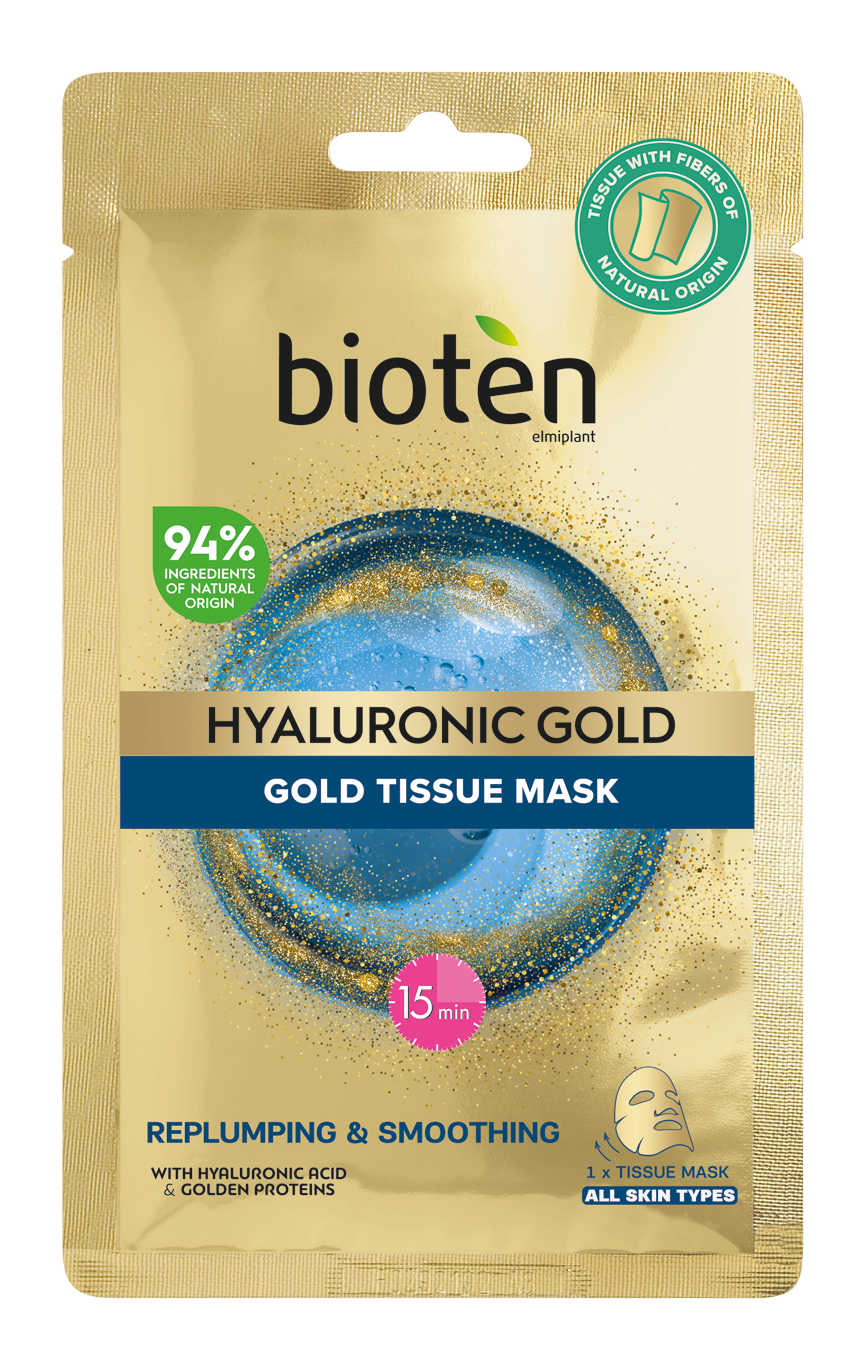 Η υφασμάτινη μάσκα Hyaluronic Gold είναι εμπλουτισμένη με υαλουρονικό οξύ και χρυσές πρωτεΐνες που βοηθούν στην αναδόμηση του δέρματος και προσφέρουν μια αίσθηση άμεσης ενυδάτωσης. Η πολυστρωματική του μορφή προϊόντος βοηθά στην ενισχυμένη απορρόφηση των ενεργών συστατικών.