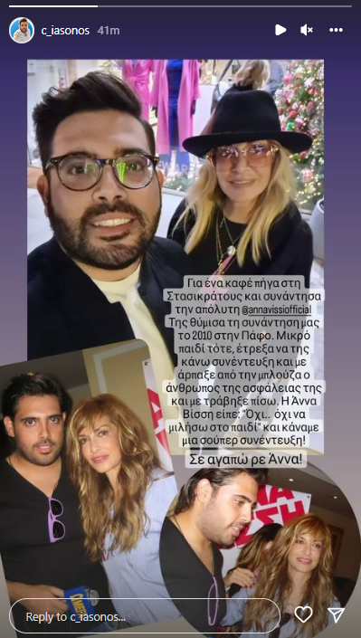 Ποζάροντας και οι δυο μαζί χαμογελαστοί, ο παρουσιαστής, σχολίασε τα ακόλουθα στην εικόνα που μοιράστηκε με τους ακόλουθούς του: “Για ένα καφέ πήγα στη Στασικράτους και συνάντησα την απόλυτη, Άννα Βίσση. Της θύμισα τη συνάντηση μας το 2010 στην Πάφο. Μικρό παιδί τότε, έτρεξα να της κάνω συνέντευξη και με άρπαξε από την μπλούζα ο άνθρωπος της ασφάλειας και με τράβηξε πίσω. Η Άννα Βίσση είπε: “όχι..όχι να μιλήσω στο παιδί και κάναμε μια σούπερ συνέντευξη. Σε αγαπώ ρε Άννα”. Δείτε την εικόνα πιο κάτω: