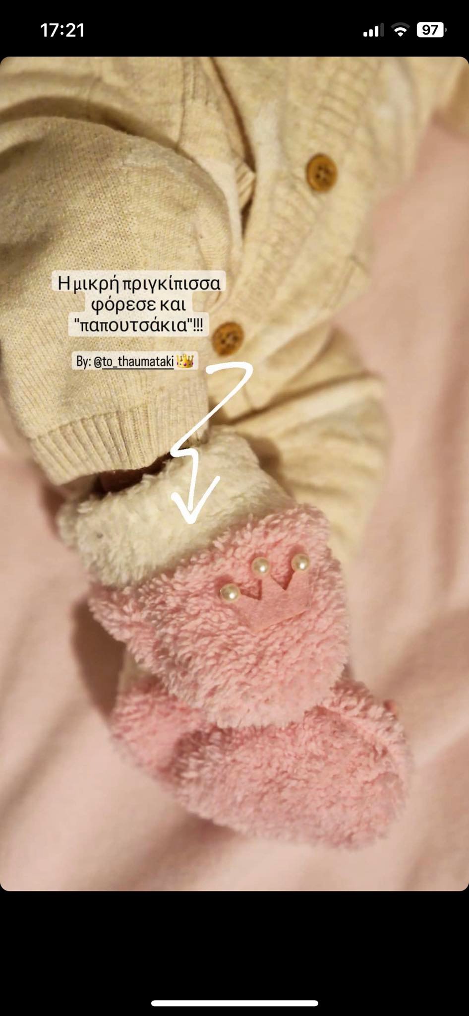 Συγκεκριμένα, είδαμε σε πρώτο πλάνο τα πατουσάκια της μικρούλας με την Χριστιάνα Θεοδώρου, ενθουσιασμένη, να σχολιάζει πως η πριγκίπισσα της φόρεσε και παπουτσάκια. Δείτε την εικόνα πιο κάτω: