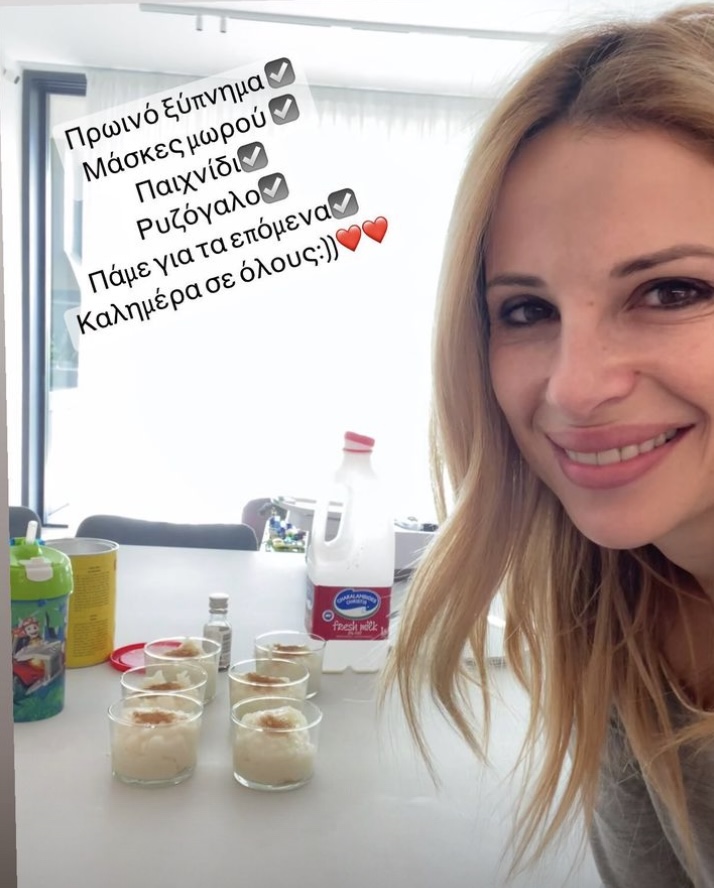 Μεταξύ αυτών ήταν και μάσκες για ένα από τα δύο της παιδιά που πιθανότατα ταλαιπωρείτε από κάποια ελαφριά αρρώστια, έπαιξε με τα παιδιά της και τους έφτιαξε ρυζόγαλο το οποίο είναι από τις αγαπημένες συνταγές της παρουσιάστριας. Δείτε πιο κάτω τη φωτογραφία: