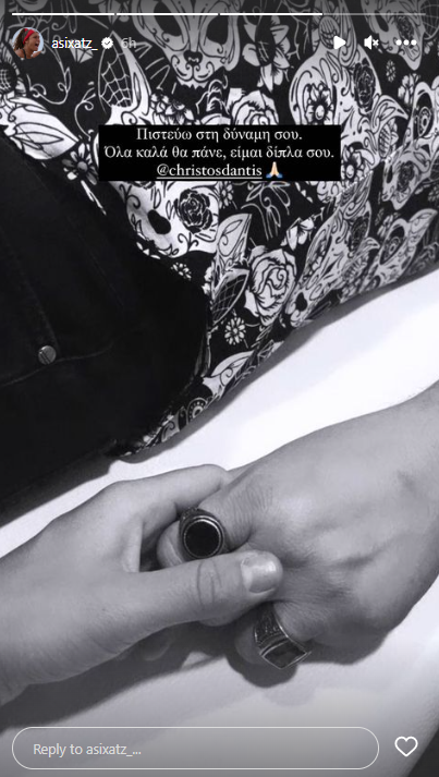 Στο αμέσως επόμενο story της, η Ασημίνα, μας δείχνει πως είναι δίπλα στον άνθρωπό της σε αυτές τις δύσκολες του στιγμές, κρατώντας του τρυφερά το χέρι, σχολιάζοντας: "Πιστεύω στη δύναμή σου. Όλα καλά θα πάνε. Είμαι δίπλα σου". Δείτε τις εικόνες: