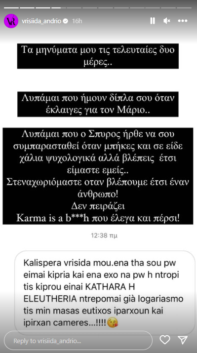 Χαρακτηριστικά έγραψε τα ακόλουθα: "Τα μηνύματα μου τις τελευταίες δύο μέρες. Λυπάμαι που ήμουν δίπλα σου όταν έκλαιγες για τον Μάριο. Λυπάμαι που ο Σπύρος ήρθε να σου συμπαρασταθεί όταν μπήκες και σε είδε χάλια ψυχολογικά, αλλά βλέπεις έτσι είμαστε εμείς… Στενοχωριόμαστε όταν βλέπουμε έτσι έναν άνθρωπο. Δεν πειράζει, karma is a bitch που έλεγα και πέρσι. Όταν σε έχει εκθέσει ένας Μάριος, μόνο ο Σπύρος σε υπερασπίστηκε. Λυπάμαι που έμπλεξες στην κλίκα της συμφοράς που σε χρησιμοποιούν για να σπάσουν την παρέα και το κατάφεραν… Μόλις τελειώσουν μαζί σου θα σε πετάξουν ξανά". Δείτε την εικόνα πιο κάτω: