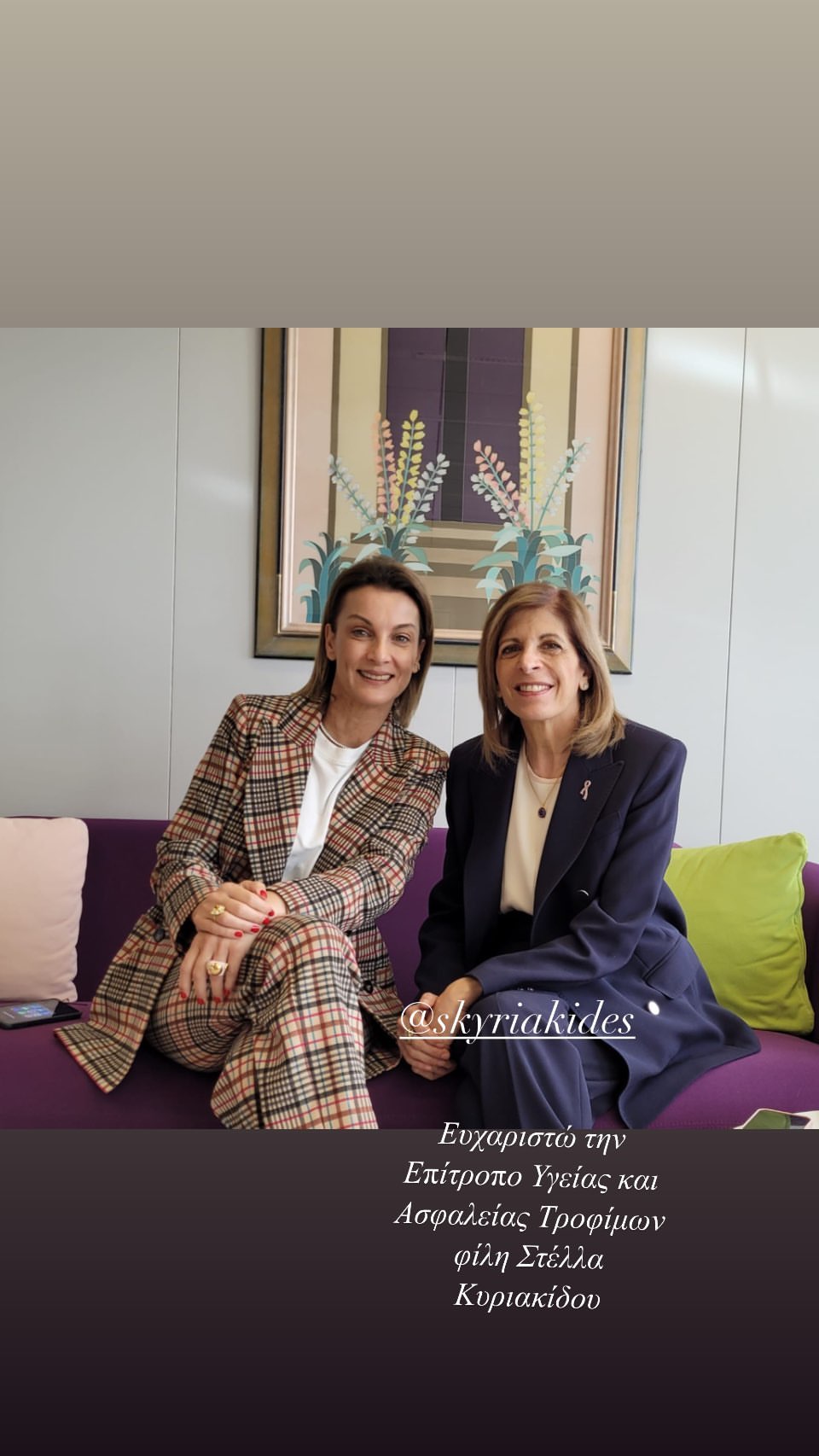 Στις Βρυξέλλες βρίσκεται η Γιώτα Παπαδοπούλου και συγκεκριμένα στο Ευρωπαϊκό Κοινοβούλιο όπου συνάντησε την Στέλλα Κυριακίδου, την Επίτροπο Υγείας και Ασφάλειας των Τροφίμων της Κομισιόν.