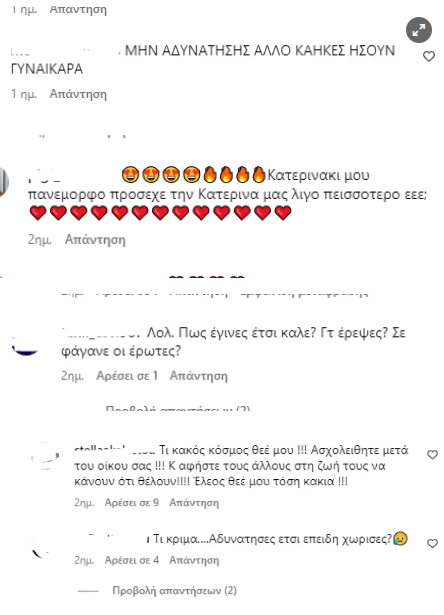 Μεταξύ αυτών πετύχαμε comments του τύπου, "Πολύ αδύνατη κορίτσι μ πάρε λίγα κιλά," Τι κριμα….Αδυνατησες ετσι επειδη χωρισες;" Πως έγινες έτσι καλε; Γτ έρεψες; Σε φάγανε οι έρωτες;" Δείτε τις σχετικές εικόνες στην gallery πιο κάτω: